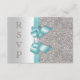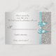 Tarjetas de respuesta formales personalizadas planas para cualquier evento: bodas, baby showers, fiestas de cumpleaños, dulces 16, celebraciones de Quinceañera, compromisos, despedida de soltera, etc. Elegantes tarjetas de respuesta personalizadas con colores plata y azul turquesa / turquesa, impresas a doble cara con un hermoso brillo, lentejuelas, patrón de purpurina, lazos y cintas vectoriales brillantes y bonitas, y diamantes con joyas brillantes y texto gris oscuro. Estas tarjetas de respuesta glamurosas y elegantes de plata y turquesa están decoradas en ambos lados. Tarjetas dobles hermosas, chic, modernas y con glamour. Tenga en cuenta: todas las invitaciones en Zazzle tienen imágenes impresas planas. Tengo productos a juego en mi tienda. El texto, la fuente y los colores de la fuente son personalizables para satisfacer sus necesidades. Si necesita ayuda para personalizar su producto, por favor contácteme a través de mi tienda. Estaré encantado de ayudar. POR FAVOR TENGAN