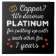 Diseño divertido, perfecto para todo aquel que haya estado casado por 7 años y para una ceremonia de renovación de la promesa boda. ¡Es un gran conjunto para las parejas! 'Cobre? Merecemos Platinum por aguantarse la cita de 7 años para una pareja que se casó hace 7 años o una pareja que renueva los votos bodas en su aniversario de cobre. ¿Eres un marido o una mujer romántica? ¡Acentúa tu estilo con este arte! Gran regalo para tu amigo que se casó hace 7 años, esposo o esposa de 7 años, o papá y mamá celebrando su sétimo aniversario de boda.