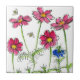 Baldosas de cerámica de bonito decoradas con flores de cosmos rosas brillantes, nigella azul y abejas melíferas zumbando alrededor dibujado en bolígrafo negro y tinta con acuarela. ¡Decoración de bonito!
