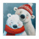 Esta imagen muestra a dos osos polares en un abrazo reconfortante, ambientados en un fondo nevado de tono verde azulado. El oso más grande lleva un gorra de cuchillos rojos, decorado con estampados sutiles, mientras que el más pequeño está envuelto en una bufanda roja brillante. Ambos osos tienen mejillas suaves y rosas y expresiones serenas, creando un ambiente cálido y afectuoso de invierno. El estilo pintoresco y con texturas realza el calor y el encanto de la escena.