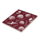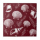 Baldosas cerámicas en forma de conchas y delicadas algas dispuestas sobre un fondo marrón rojo profundo, creando un sorprendente contraste. El trabajo detallado de la línea añade un toque intrincado y naturalista a la composición.