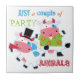Aquí hay un divertido y colorido mosaico de la cocina que incluye dos vacas personalizados "animales fiestas". Una está vestida con una camisa tropical de flor verde lima y naranja. El otro lleva un sombrero negro y sopla un ruido. El texto estilizado dice "Sólo un par de ANIMALES FIESTAS". Los colores utilizados son rosa, azul, verde cal, negro, blanco y naranja. ¡Qué lindo! *La imagen prediseñada utilizada en este diseño está protegida por derechos de autor por Encore Software, Inc., que permite su uso a sus licenciantes. Todos Los Derechos Reservados.