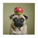 Gracioso Pug con una manzana balanceándose encima de su cabeza.