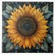 Representación artística de un gran girasol con pétalos detallados sobre un fondo oscuro decorativo lleno de hojas.