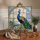 Agregue un toque de elegancia atemporal a la decoración de su hogar con este impresionante diseño de falso vidrio emplomado de pavo real. Esta obra de arte captura la belleza majestuosa de un pavo real de perfil, con vibrantes tonos de azul real, verde esmeralda y azul turquesa sobre un fondo geométrico cálido y beige. El diseño imita la apariencia intrincada del vidrio estilo Tiffany y el mosaico, completo con líneas emplomadas y texturas iluminadas.