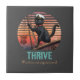 Atardecer de gato negro: un viaje a la teja de cerámica THRIVE: un gato negro vestido con el gorra del capitán y parado en la proa de un barco, navegando hacia una vibrante puesta de sol retro.