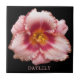 Baldosa cerámica que muestra la imagen de una hermosa flor diurna rosa sobre un fondo negro. ¡Un diseño dramático y floral! Seleccione su tamaño de mosaico. ¡Hace un gran trivet de cocina!
