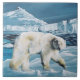 Un oso polar blanco en la nieve del invierno ártico con un iceberg detrás.