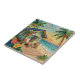 A pretty impasto beach themed tile with a cute beach house, palm trees and tropical flowers.