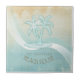 Este diseño de azulejos de cerámica en los suaves colores del mar y la arena le permite añadir fácilmente su propio nombre y texto usando la plantilla proporcionada. La simple imagen de las palmeras sobre un fondo acuático angustiado se ve resaltada por el acento ondulado del agua y del blanco. Si no tienes la fortuna de tener una casa de playa o una cabaña, cambia el texto de este divertido diseño a lo que más te convenga. Busque ID623 para ver la coordinación de elementos costeros y productos adicionales con este diseño.