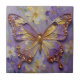 A tile with an illustration of a beautiful gold and purple butterfly surrounded by white and purple flowers. It's done with an impasto style and just emanates beauty and grace.