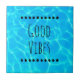 Baldosa cerámica que dice: Buenas vibraciones, con una fotografía de agua clara de la piscina azul, con reflejos brillantes.