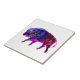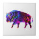 una obra de arte decorativa de un búfalo o bisonte muy colorido con todos los colores del arcoiris sobre su silueta sobre una baldosa de cerámica.