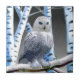 Un búho de ojos azules de la nieve se encaramó en miradas fijas nevadas de abedul de un miembro de árbol en nosotros con una mirada hipnótica pacífica que wows al espectador.