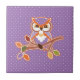 ¡" Es otoño! Asga este búho lindo del lunar para su tabla del día de fiesta. El diseño incluye un búho grande del lunar de la lila que se sienta en una rama resumida en blanco y naranja. El fondo en esta teja adorable es lila con los lunares blancos."