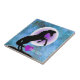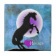 Un diseño de fondo azul/verde con la silueta negra de un caballo, una luna de gradiente blanco/violeta, un corazón magenta y la palabra "Caballos". Decoración de una pequeña estantería o de una zona de mostrador con esta hermosa pieza en un pequeño caballete.