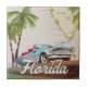Hermoso mapa ilustrado del estado de Florida y las islas de la región en un hermoso estilo vintage con un auto retro de los años 50.