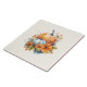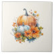 Baldosa cerámica con una imagen de la temática de la caída. Calabazas naranjas y blancas rodeadas de hojas caídas y flores naranjas.