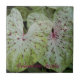 Baldosa cerámica que presenta una imagen fotográfica de hojas bicolor de color verde claro del Caladio con espinillas rosas. También conocido como Ángel Alas, Corazón de Jesús, y Oído Elefante. ¡Un bonito diseño floral! Seleccione su tamaño de mosaico. ¡Hace un gran trivet de cocina!