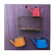 Cuidados y coloridos recubrimientos de agua contra una pared de madera pintada de color morado. La decoración del jardín es muy bonita y creativa.
