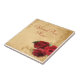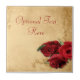 Elegante diseño de plantilla de boda marrón caramelo vintage con rollos decorativos de esquina en la parte superior e inferior con una foto de tres rosas rojas en la esquina inferior. El fondo recibe una aplicación de grunge texturado para una apariencia de papel antiguo. Este diseño tiene varios antecedentes ya hechos. Este diseño también viene en muchos otros productos de papelería para satisfacer todas las necesidades de su boda.
