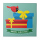 Cardenal rojo lindo abriendo un regalo azul con cinta amarilla. Un cartel rojo saludando a "MERRY NAVIDAD" completa el diseño. ¿Cuál es tu regalo para los Navidades?