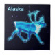 Un caribú azul toro brillante, o reno, superpuesto sobre un fondo de estrellas. El texto que dice "Alaska" también aparece en azul brillante y blanco. El caribú (Rangifer tarandus), conocido como el reno fuera de América del Norte, es un ciervo del Ártico y el subártico. Si bien en general se han extendido y son numerosas, algunas subespecies son raras y una se ha extinguido. La palabra inuit tuktu significa - ciervo que nunca deja de moverse. Los caribúes siempre están en movimiento, yendo al norte a la cala, dirigiéndose a los jardines de invierno, y al sur en verano. El caribú tiene un color y un tamaño considerables. Únicamente entre los ciervos, ambos géneros cultivan cánceres, aunque son mayores en los machos y hay algunas poblaciones donde las hembras no las tienen por completo. La caza y el pastoreo de los caribúes de renos semidomesticados (carne, pieles, corderos, leche y transporte) son importantes para varios pueblos del Ártico y del submarino. Incluso lejos de su alcance, el caribú/reno es bien conocido debido al mito, probablemente originado a principios del siglo XIX en América, donde el trineo de Santa Claus es arrastrado por renos voladores, un popular elemento secular de Navidades. En la Laponia real, los renos tiraban de una pasta. Distribución y hábitat El caribú/reno es una especie extendida y numerosa en el Holártico septentrional, presente tanto en tundra como en taiga (bosque boreal). Originalmente se encontró en Escandinavia, Europa oriental, Rusia, Mongolia y el norte de China al norte de la latitud 50. En América del Norte, se encontró en Canadá, Alaska (EE.UU.) y en el norte de los EE.UU. de Washington a Maine. En el siglo XIX, aparentemente seguía presente en el sur de Idaho. También ocurrió de manera natural en Sajalín, Groenlandia y probablemente incluso en tiempos históricos en Irlanda. A finales de la era del Pleistoceno, los renos se encontraban tan al sur como Nevada y Tennessee en América del Norte y España en Europa. Hoy en día, las especies han desaparecido de muchas áreas dentro de este amplio rango histórico, especialmente de las partes del sur, donde se desvaneció casi por todas partes. Todavía hay grandes poblaciones en Noruega, la región de Markku de Finlandia, Suecia, Siberia, Groenlandia, Alaska y Canadá. Los renos domesticados se encuentran mayormente en el norte de Fennoscandia y Rusia, con un rebaño de aproximadamente 150-170 renos viviendo alrededor de la región de Cairngorms en Escocia. Los últimos renos de tundra salvajes que quedan en Europa se encuentran en partes del sur de Noruega. A principios del siglo XX se introdujeron algunos renos de Noruega en la isla del Atlántico Sur de Georgia del Sur. Hoy, hay dos rebaños distintos que todavía prosperan allí, separados permanentemente por los glaciares. Sus números totales no superan los pocos miles. La bandera y el escudo de armas del territorio contienen una imagen de reno. Se han introducido alrededor de 4.000 renos en el archipiélago subantártico francés de las islas Kerguelen. El este de Islandia tiene una pequeña manada de unos 2500-3000 animales. El número de caribúes y renos ha fluctuado históricamente, pero muchos rebaños están en declive a lo largo de su gama. Este declive mundial está vinculado al cambio climático para el norte, los caribúes migratorios y los rebaños de renos y la perturbación industrial del hábitat de los caribúes para los rebaños sedentarios y no migratorios. El color de los Pieles de Piel varía considerablemente, tanto de forma individual como en función de la estación y de las subespecies. Las poblaciones septentrionales, que suelen ser relativamente pequeñas, son más blancas, mientras que las del sur, que suelen ser relativamente grandes, son más oscuras. Esto se puede ver bien en América del Norte, donde la subespecie más septentrional, el caribú de los Pares, es la subespecie más blanca y pequeña del continente, mientras que la subespecie más meridional, el caribú de los bosques, es la más oscura y grande. El abrigo tiene dos capas de piel, un abrigo grueso de lana y un abrigo de pelo más largo compuesto de pelos huecos y llenos de aire. Antlers Los renos crecen de nuevo cada año bajo una capa de piel llamada terciopelo. En la mayoría de las poblaciones, ambos sexos cultivan ángulos, que (en la variedad escandinava) caen en diciembre para los hombres de edad avanzada, para los hombres jóvenes en la primavera temprana y para las mujeres en verano. Los cantantes suelen tener dos grupos separados de puntos, uno inferior y otro superior. Los renos domesticados son más cortos y pesados que sus homólogos salvajes. Hay una considerable variación subespecífica en el tamaño de las gargantas (por ejemplo, más bien pequeñas y espinosas en las subespecies más septentrionales), pero en algunas subespecies, las gargantas de los renos toros son las segundas mayores de cualquier venado existente, después del alce, y pueden alcanzar hasta 39 pulgadas (100 cm) de ancho y 53 pulgadas (135 cm) longitud del haz. Tienen las mayores reglas en relación con el tamaño del cuerpo de los ciervos. El tamaño de Antler juega un papel importante en el establecimiento de la jerarquía de grupos. Nariz y pezuñas Los renos tienen narices especializadas con huesos de turbinato nasal que aumentan dramáticamente la superficie dentro de las fosas nasales. El calor corporal del animal calienta el aire frío entrante antes de entrar en los pulmones, y el agua se condensa desde el aire espirado y se captura antes de exhalar el aliento del ciervo, se utiliza para humedecer el aire entrante y posiblemente se absorbe en la sangre a través de las membranas mucosas. Las pezuñas de reno se adaptan a la temporada: en verano, cuando la tundra es suave y húmeda, las pastillas se convierten en esponjas y aportan tracción extra. En invierno, las almohadillas se encogen y aprietan, exponiendo el borde de la 