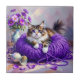 A tile with a sweet kitty cat sitting on a ball of purple yarn and next to a purple vase of flowers.