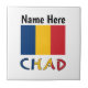 La bandera de Chad muestra estos objetos. Debajo está la palabra CHAD en los colores de la bandera. Arriba hay un lugar para un nombre. Personaliza para un regalo especial o personalizar para el brillo fresco.