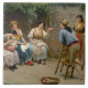 Este diseño presenta un cuadro del artista italiano Eugene de Blaas (1843-1931). Representa a un grupo de mujeres trabajando en algunas cositas en el jardín; están charlando con un niño que se está apoyado en la parte trasera de una silla de madera. También hay fruta en un bol de mimbre, tal vez manzanas. Las mujeres se ven felices y animadas mientras el chico las entretiene con su charla. También hay otra mujer parada al lado de un muro de ladrillo cercano con sus brazos akimbo. Al fondo se ve una pérgola con hiedra que crece sobre ella. El suelo está polvoriento, pero las mujeres están usando vestidos elegantes, y el niño está usando una camisa azul y un gorra tradicional, con una bandana o bufanda envuelta alrededor de su cuello. El arte original fue pintado en 1905.