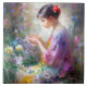 Azulejo Chica admirando una flor en sus manos