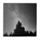 Esta foto blanco y negro ofrece un cielo nocturno sobre el bosque.