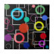 Diseño de estilo retro con círculos coloridos y cuadrados blancos sobre fondo negro