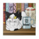 El gato de esmoquin blanco y negro se despierta en un mostrador de cocina con sus libros para cocinar, tazas para café, azúcar y crema.