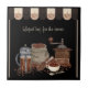 Embrace warmth with this comforting wall art ceramic tile, showcasing a classic French press, a bag of coffee beans, and a cozy cup. The inviting and customizable phrase "Liquid hug for the senses" adds a touch of tender sentiment to the deep, solid black backdrop. This illustrative piece is perfect for creating a warm, welcoming atmosphere in any breakfast nook or coffee shop. Discover coordinating pieces in our full collection to complete your personalized display!