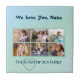Honor Nana with a timeless tile design that blends modern elegance and family warmth. Six cherished photos are arranged in a clean 3‑across, 2‑down collage bordered by soft aqua‑green. “We Love You Nana” appears in Anastasia script with a subtle blue shadow, while “The Heart of Our Family” in Playfair font is encircled by a delicate black outline heart. A refreshing turquoise and blue‑green gradient background adds cool sophistication, creating a heartfelt keepsake that celebrates love and connection.