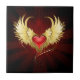 Corazón rojo brillante de un ángel con alas doradas brillando en el fondo rojo oscuro y radiante decorado con un patrón.