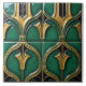 Four square tiles are arranged in a 2x2 grid, each featuring a distinct Art Deco-style design. The tiles are predominantly green with gold and black accents. The top two tiles display a stylized floral motif with a central vertical element flanked by curved shapes, all in gold and black, set against the green background. The bottom two tiles showcase a different design, with a gold circle of small dots surrounding a black and gold stylized flower shape.