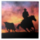 Imagen de arte campestre occidental de un vaquero y un caballo rociando un toro en una colorida puesta de sol en el suroeste.