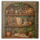 A cozy retro-inspired design featuring a charming bookshelf filled with vintage books, delicate botanical accents, and a comforting cup of tea or coffee. Nestled among the pages sits an assortment of artist supplies, adding a whimsical touch of fantasy to this warm and inviting book-lover scene.