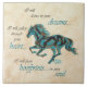 Brilla tu casa con este singular mosaico decorativo de caballos "uno de clase" Inspirador. Cuenta con una Gallopaje Turquesa de Caballo en Turquesa, Negro y Oro en un fondo marrón claro de madera y una Inspiradora Cita... "Bailaré en tus sueños" ~ Voy a galopar a través de tu corazón" ~ ¡Plantaré Huellas en tu alma"!