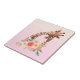 Baldosa de cerámica con un lindo dibujo en acuarelas de una madre y una jirafa de bebé. La jirafa madre está descansando su cabeza sobre la jirafa del bebé, amorosa y adorable. un ramo de flores color agua rosa, amarillo, verde y colocado debajo de este querido par. Fondo de degradado creado con una mezcla de color rosa suave en color naranja color de color claro y color de color azul.