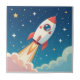 Cute cohete rojo y blanco despegando en el espacio con estrellas y nubes caprichosas.
