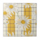 Alegre baldosa cerámica de patrón floral con dásidos blancos nítidos con centros amarillos soleados colocados contra una rejilla crema clara y rayas verticales amarillas. El estilo limpio, hecho a mano y la paleta de colores frescos evocan una estética brillante, edificante y atemporal, perfecta para la primavera, el verano y los diseños inspirados en la naturaleza.