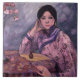 Este diseño presenta una pintura del artista impresionista japonés Fujishima Takeji (1867-1943). Muestra a una elegante dama asiática usando un kimono tradicional que es principalmente rosa y morado con un patrón negro. Ella descansa sobre una mesa en la que se coloca una pequeña botella de perfume. También hay un jarrón de rosas rosas rosas sobre la mesa. Es una imagen de lujo y elegancia moderada.