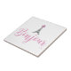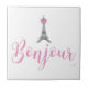 Este diseño de la Torre Eiffel Bonjour y el arco rosado se ve elegante en esta baldosa. Diseño de Inge Lewis. Encontrará más artículos coincidentes en la tienda en línea ingeinc.com.