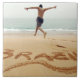 DERECHOS DE AUTOR Stephanie Rabemiafara / DanitaDelimont.com| AF36 SRA0000.jpg| BRASIL. Hombre barechest usando un traje de baño saltando sobre la arena por el nombre que Brasil escribió en la arena, saltando hacia el mar