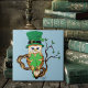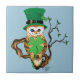 Búho lindo que lleva un sombrero verde de duende con dos tréboles en él.