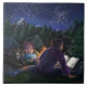 El arte nocturno estrellado de Traci Van Wagoner print, posters, accesorios y regalos presenta nuestra pintura original de dos niños y su perro negro grande acampando bajo las estrellas leyendo un fantástico libro alrededor de un incendio en un campamento sobre caballeros y dragones. La magia de la historia se desliza hacia el cielo estrellado para mostrar un caballero y un dragón en un eterno baile nocturno de estrellas. Disfrute de un campamento nocturno de verano en las montañas.