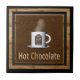 Representación digital de una taza de chocolate caliente al vapor sobre un signo de pared de madera.